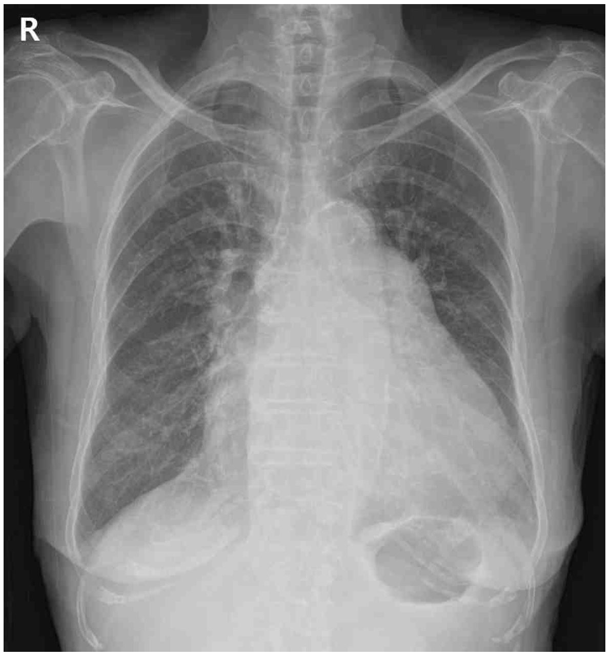 72세 여자가 6개월 전부터 숨이 차서 병원에 왔다. 호흡곤란이 1개월 전부터 점차 심해진다고 한다. 혈압 112/52 mmHg, 맥박 82회/분, 호흡 20회/분, 체온 36.1℃이다. 심음은 불규칙하지만 잡음은 없고 양쪽 등아랫부분에서 거품소리가 들린다. 가슴 X선사진과 심전도이다. 검사 결과는 다음과 같다. 진단은?