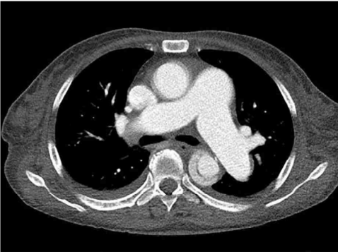 • 폐렴: 폐 실질에 감염이 발생한 질환으로 본 증례의 CT 소견 상 descending aorta 내부의 free flap이 관찰되므로 AD이다.