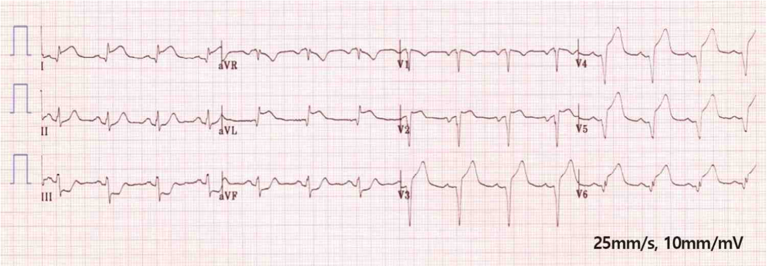 • ECG에서 lead V2-4의 anterior lead와 lead I, aVL, V5, V6의 lateral lead에서 ST elevation을 보인다. 또한 ST elevation이 있는 lead의 반대쪽 inferior lead(II, III, aVF)에서 ST depression이 보이므로 reciprocal change를 확인할 수 있다.