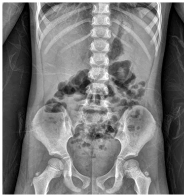3세 여아가 2일 전부터 토해서 응급실에 왔다. 1일 전부터는 물 같은 설사를 하루 5~7회 정도 했다. 배꼽 주위에 간헐적인 통증이 있다. 체온은 38.5℃이다. 배에 압통과 반동압통은 없다. 혈액검사 결과는 다음과 같다. 복부 X선사진이다. 원인은?