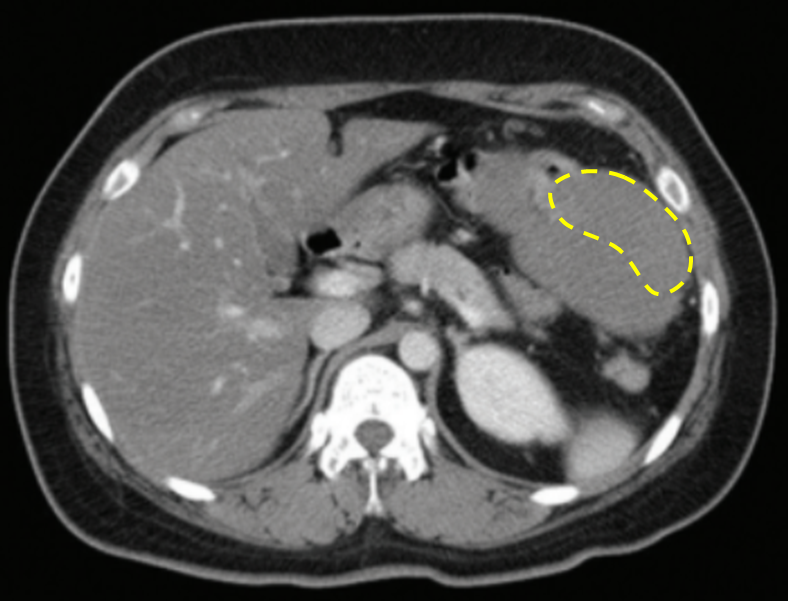 • 지라 비대: 복부 CT에서 지라비대는 보이지 않는다.
