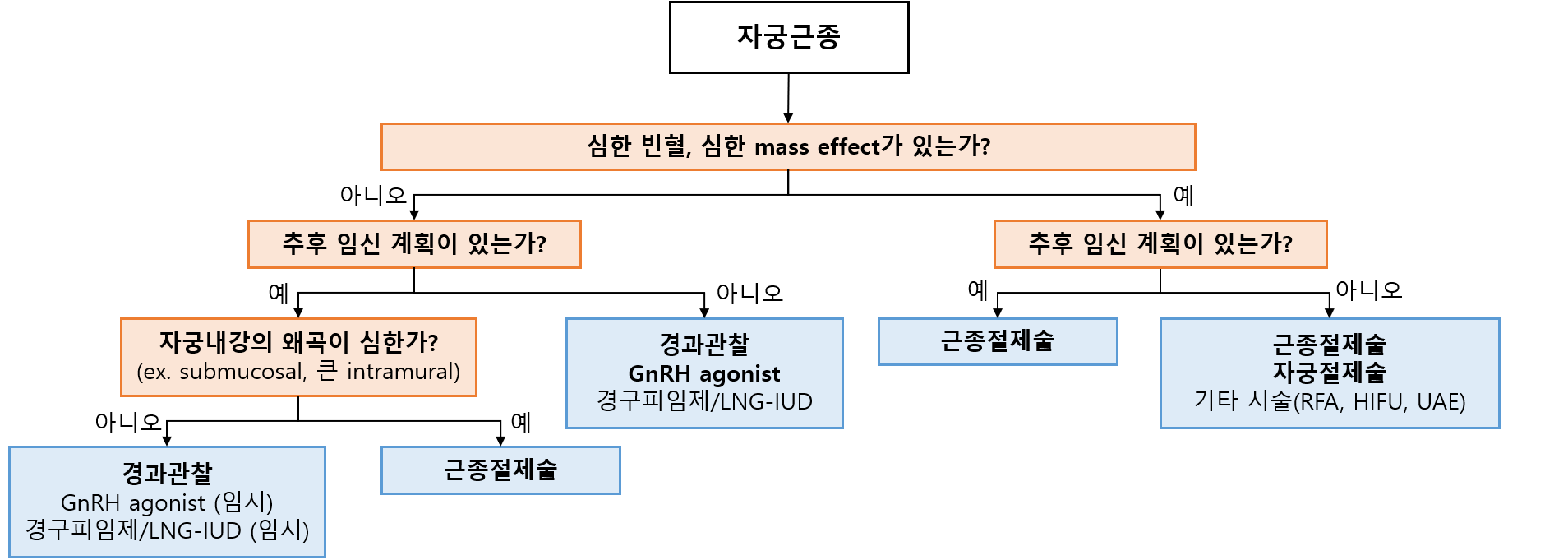 • 자궁동맥색전술(uterine artery embolization): 자궁근종의 mass 자체를 감축시켜야 하는 증상이 있으며 환자가 수술을 희망하지 않고, 더 이상의 가임력 보존이 불필요할 때 고려할 수 있는 치료법이다.