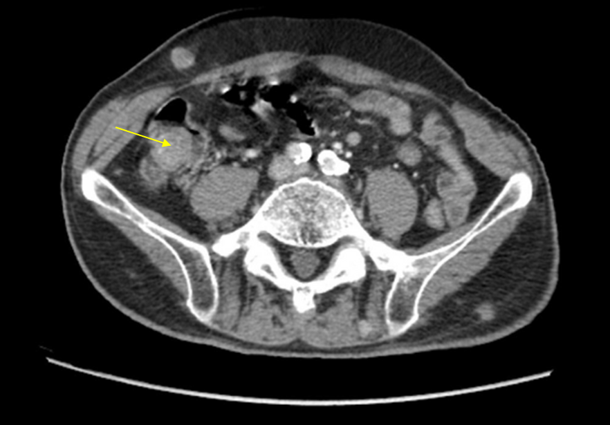 • 복부덩이와는 별개로 RLQ 통증을 호소하는데, CT상 해당 부위에 colon mass가 확인되며, 이 mass의 끝부분이 peritoneum 쪽으로 퍼져 있는 양상이 보인다.