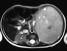 • MRI상 좌측 신장에 high signal intensity를 보이는 경계가 명확한 비균질종괴가 관찰되는데, 이는 윌름 종양을 시사하는 소견이다.
