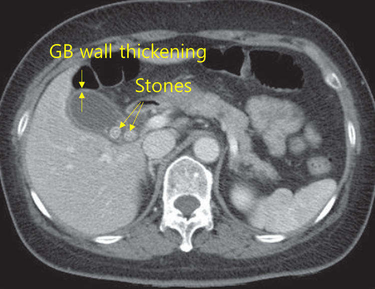 진단 | • US(1st line), CT: GB stone, GB wall thickening, pericholecystic fluid |