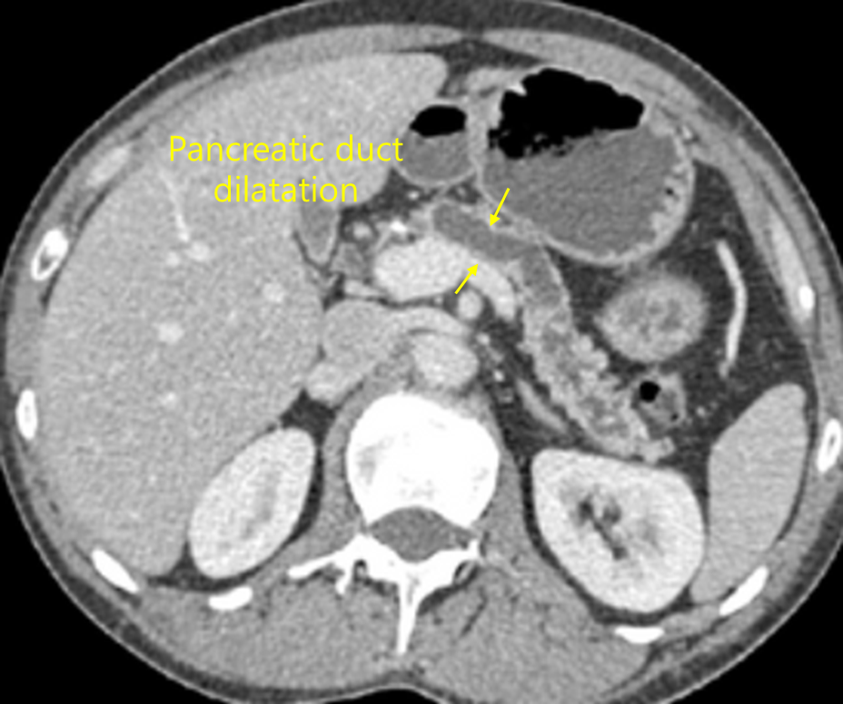 만성적인 상복부 통증, 당뇨, 음주력, 흡연력으로부터 만성 췌장염을 의심할 수 있고, CT 상 췌관 확장 소견도 만성 췌장염의 진단에 도움이 된다.