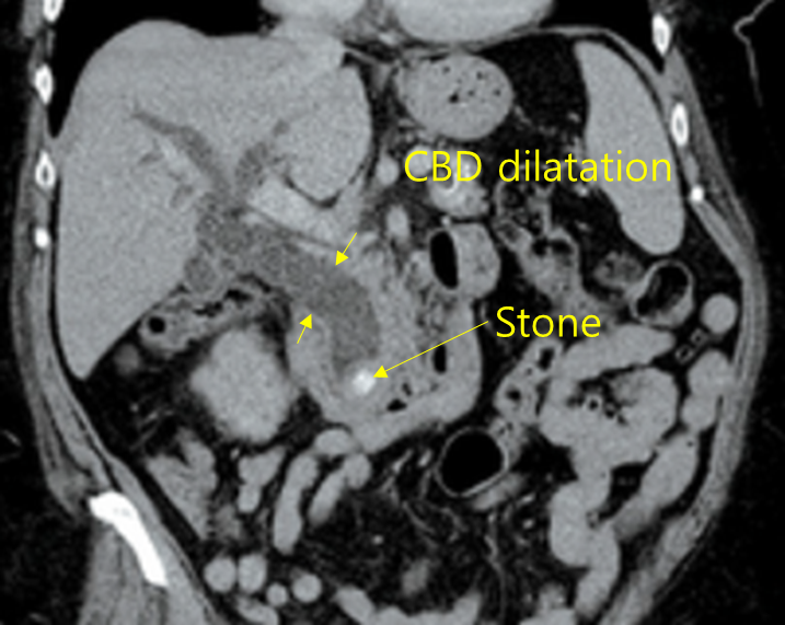 진단 | • US/CT: Bile duct dilatation, stone이 보일 수도 있음 • MRCP/ERCP: Proximal bile duct dilatation, filling defect 등 |