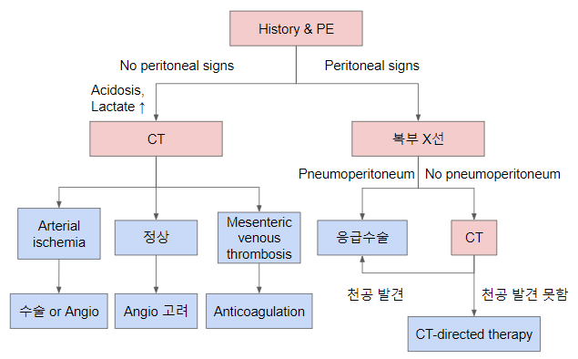 • 경과관찰: 천공 및 복막염이 의심되는 환자이므로 적극적인 개입이 필요하다.
