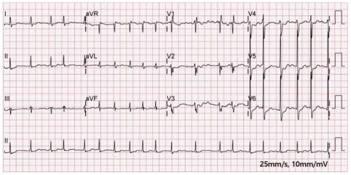 • 심전도상 P wave가 보이지 않고 irregulary irregular RR interval이 확인되므로 심방세동(AF)으로 진단할 수 있다. AF 환자가 급성적으로 배꼽주위 통증을 호소였으며, 혈변 및 설사가 동반되었으므로 혈관성 장질환이 의심된다.