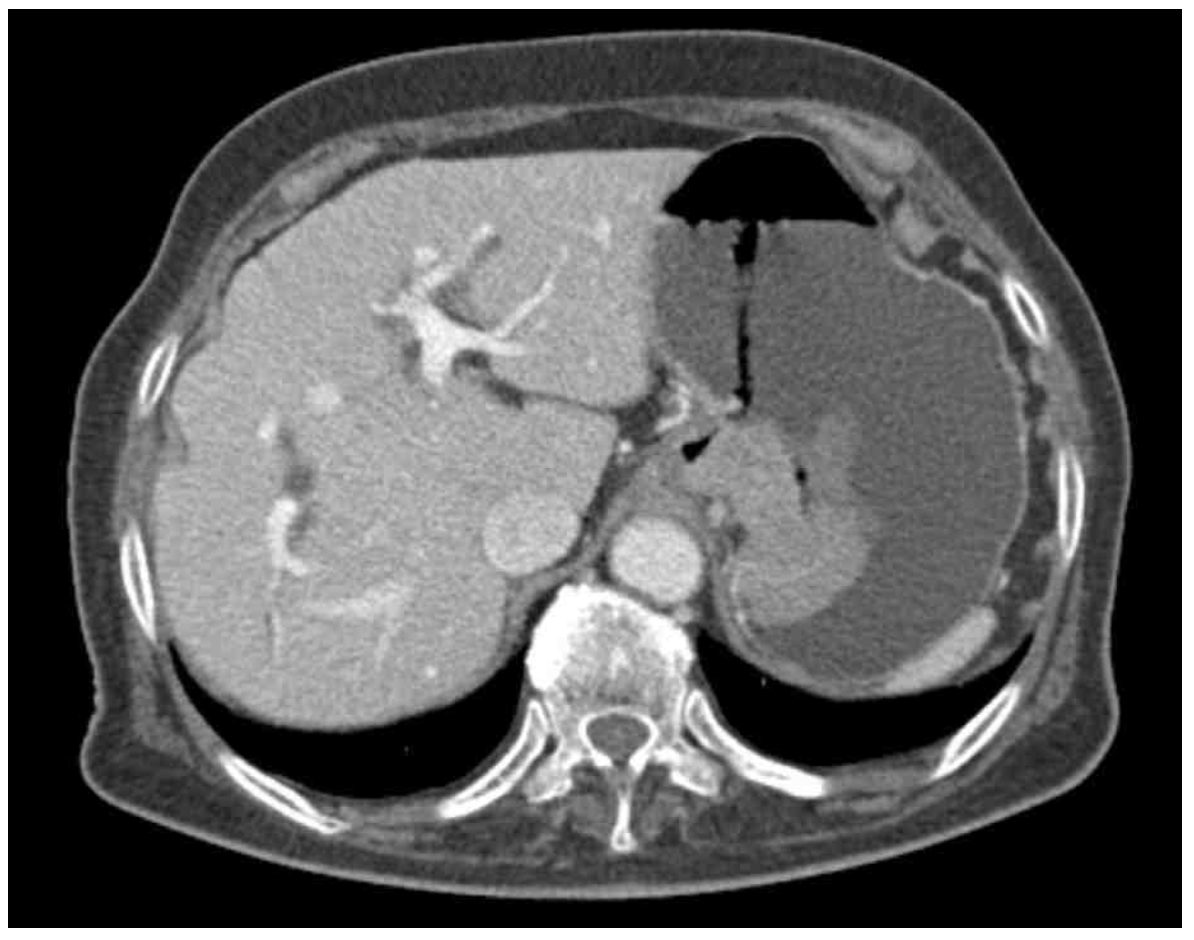 72세 여자가 1주 전부터 검은 변을 본다고 병원에 왔다. 30년 동안 매일 소주를 반 병씩 마셔왔고 6개월 전부터 소화가 잘되지 않아 소화제를 복용하고 있다. 혈압 110/70 mmHg, 맥박 78회/분, 호흡 20회/분, 체온 36.4°C이다. 배에 압통은 없으나 직장손가락검사에서 자장 색의 변이 묻어 나왔다. 혈액검사 결과는 다음과 같다. 위내시경 사진과 복부 컴퓨터단층촬영 사진이다. 진단은?