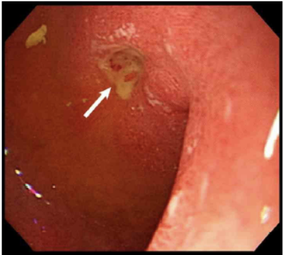 12세 남아가 6시간 전에 짜장 같은 검은색 대변을 봐서 병원에 왔다. 1주일 전부터 소화불량과 구역이 있었고 명치와 오른쪽 윗배에 쑤시는 복통이 있었다. 검사 결과는 다음과 같다. 위 내시경 사진과 십이지장 내시경 사진이다. 진단은?