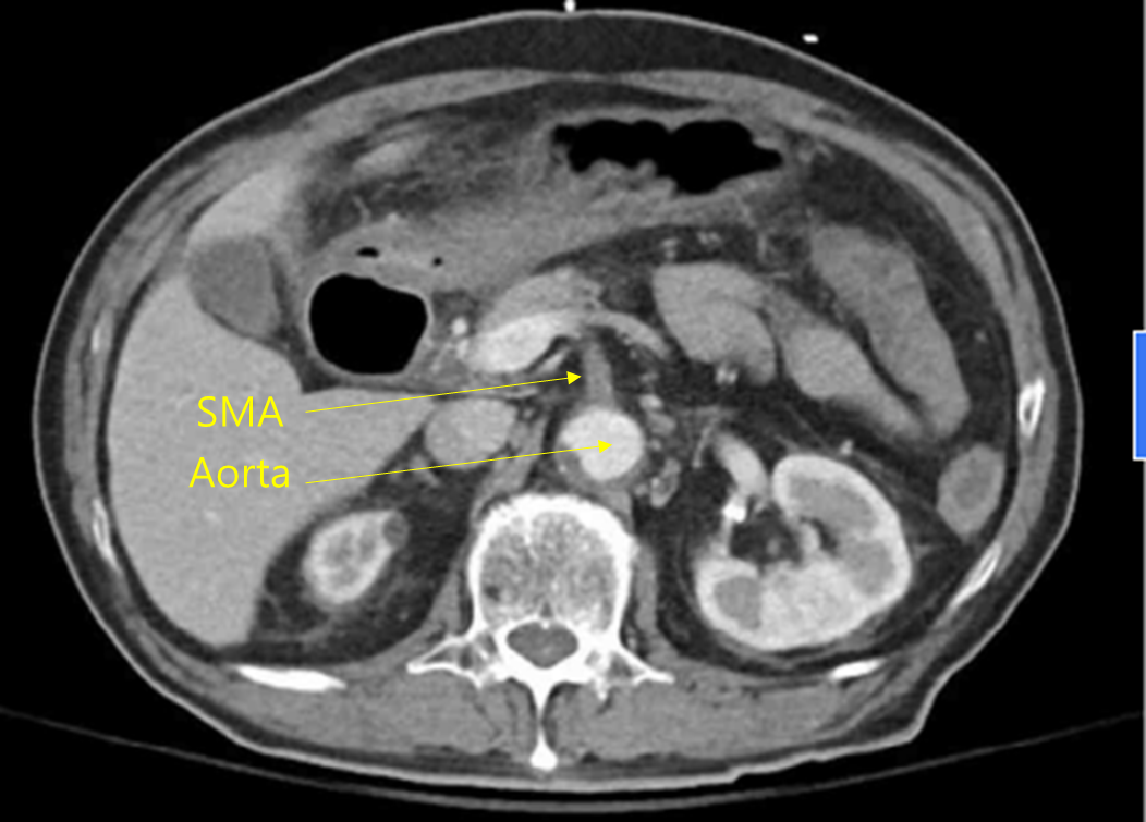고혈압 및 당뇨 기저질환을 가진 고령환자에게서 급성 복통 및 혈변이 발생하였으며, CT상 SMA stenosis/occlusion이 확인되므로 ischemic colitis로 진단한다.