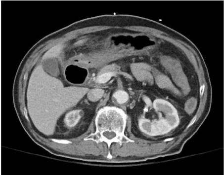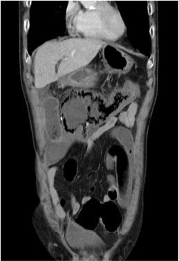 • 구불결장꼬임: 본 증례는 구불결장꼬임에서 흔히 동반되지 않는 혈변이 나타나며, 복부 CT상 mesenteric whirl sign이 관찰되지 않으므로 구불결장꼬임의 가능성은 낮다.