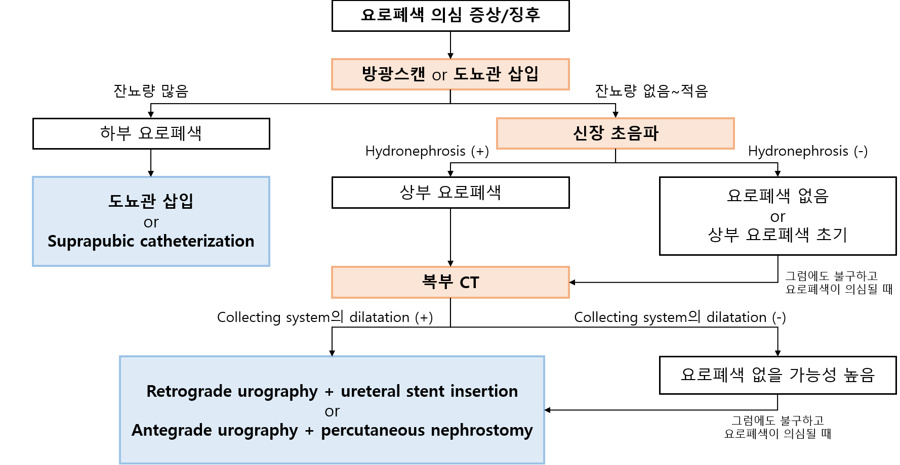 • 하부 요로폐색이 의심되므로 가장 먼저 도뇨관 삽입을 한다.