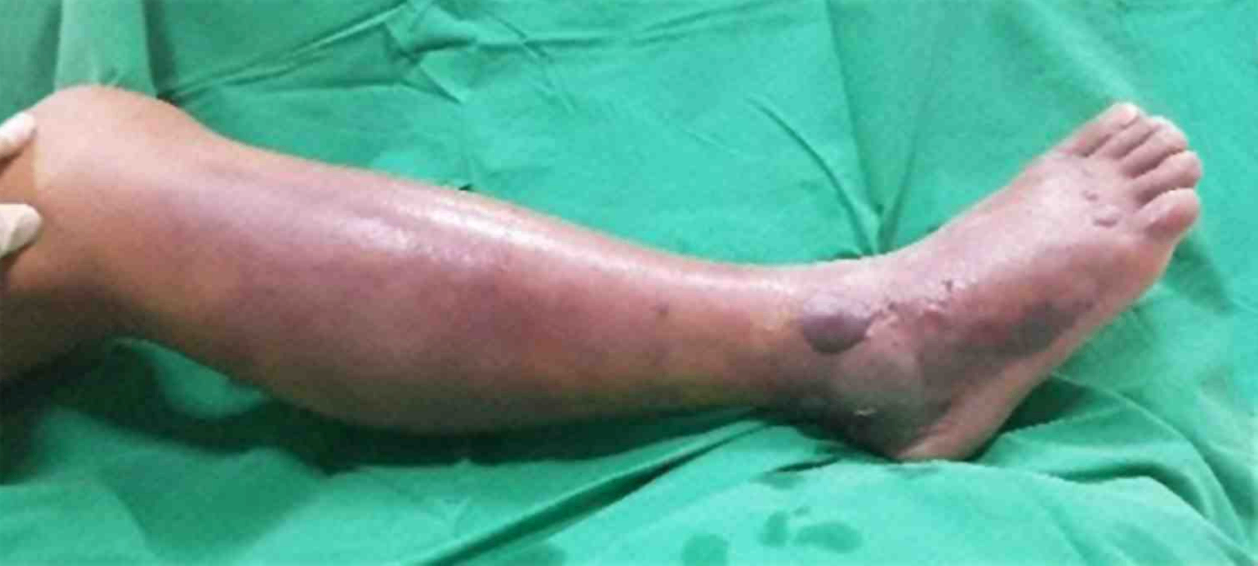 Etc | 오른쪽 다리 사진: erythema, papule, swelling, hemorrhagic bullae |