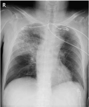 • 오른쪽 가슴에서 거품소리가 들리므로 폐렴을 의심할 수 있으며, 혈액검사에서도 염증성 질환을 시사하는 leukocytosis가 관찰된다. 나아가 CXR상 RUL lobar consolidation이 저명하게 관찰되므로 폐렴으로 진단할 수 있다.