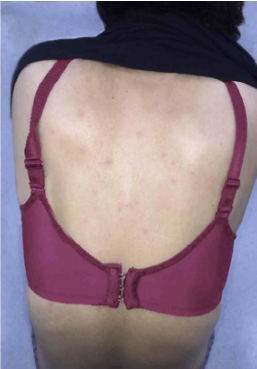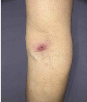 • 피부에 eschar가 확인되는데, 이는 scrub typhus를 시사하는 중요한 소견이다. 1개월 전 텃밭에서 깨를 수확했는데, 밭일을 쪼그리고 앉아서 작업하다가 진드기에 노출되었을 가능성이 높다.