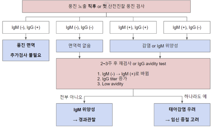 • 2-3주 후 시행한 serology 재검 결과 IgG 및 IgM titer의 증가가 관찰될 경우, 풍진-특이 IgG 항체결합능검사 상 low avidity가 확인될 경우 최근 풍진 감염을 시사한다. 반면, serology 재검 결과 IgG 및 IgM titer가 그대로 유지되는 경우, 풍진-특이 IgG 항체결합능검사 상 high avidity가 관찰될 경우 위양성을 의미한다.