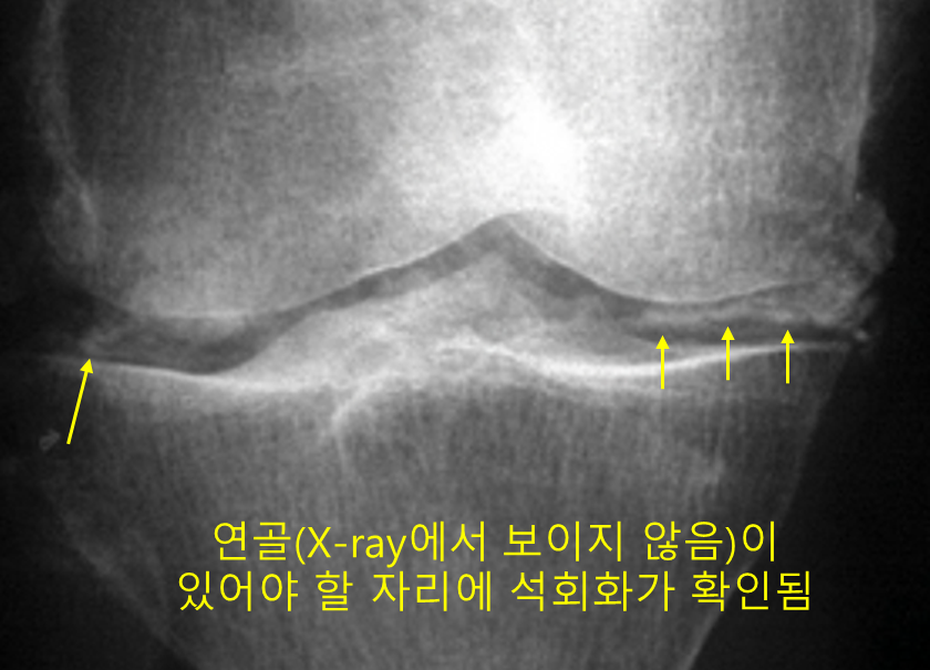 • 무릎 X-ray 상 특징적인 연골 석회화(chondrocalcinosis) 소견이 보이므로 급성 관절염 중 가성통풍(칼슘피로인산결정침착질환, CPPD)이 가장 의심된다.