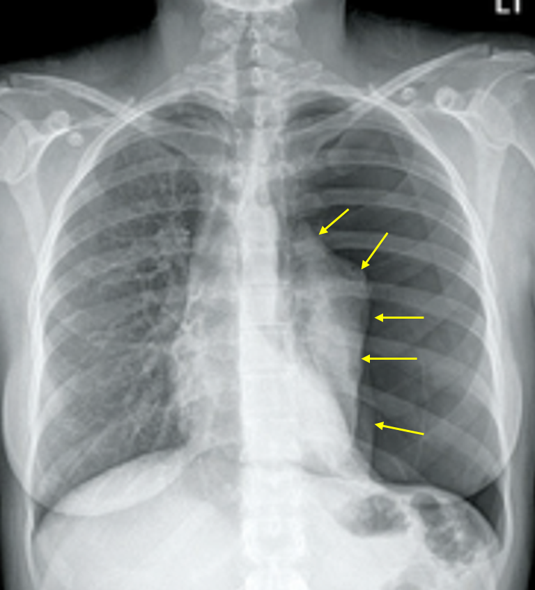 • 급성 호흡곤란, 흉통(심호흡시 악화)의 증상, 그리고 신체 검진에서 왼쪽 가슴 호흡음이 사라진 것으로 보아 무기폐 혹은 기흉이 의심된다.