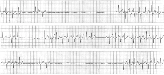 p파와 QRS 모두 보이지 않는 sinus arrest 소견이 관찰된다. sinus node의 dysfuction과 그 dysfunction으로 인한 증상(두근거림, 의식 소실)이 관찰되므로 동기능부전증후군(sick sinus syndrome)으로 진단할 수 있다. 유증상 동기능부전증후군의 치료는 영구형 인공심박동기 삽입이다.
