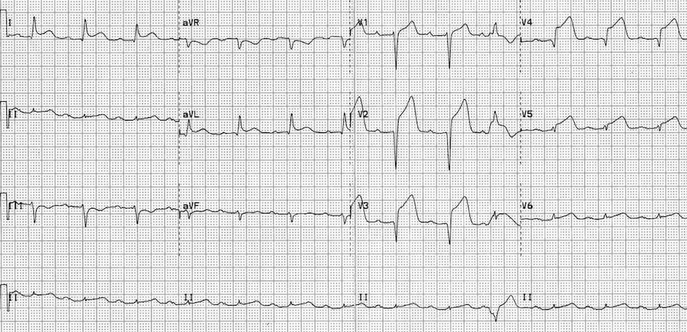 45분 전 갑작스레 발생한 흉통, 흡연력, 심전도상 ST 분절의 상승이 관찰되어 심근경색이다.