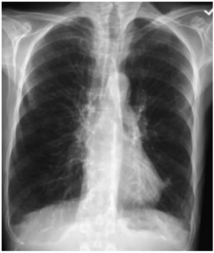 78세 남성이 숨이 차서 왔다. 환자는 3년 전부터 10분 정도 걸으면 숨이 차서 쉬었다 걸었다고 한다. 최근 5일 전부터 기침과 가래가 있었으며, 어제부터는 앉아 있어도 숨이 차다고 한다. 35갑년의 흡연력이 있다. 혈압 150/90mmHg, 맥박 110회/분, 호흡 25회/분, 체온 36.7'C, 산소포화도 92%로 측정되었다. 환자는 의식이 맑았으나, 청진 시 양측 하부 폐에서 호흡음이 감소되어 있었다. 가슴 X선 사진을 통해 확인한 결과는?
