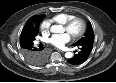 • 발열과 오한을 동반한 호흡기 증상, 오른쪽 호흡음 감소, CT 상 관찰되는 우측 흉수 등으로 흉막 삼출을 의심할 수 있으며, 부폐렴성이 의심된다.