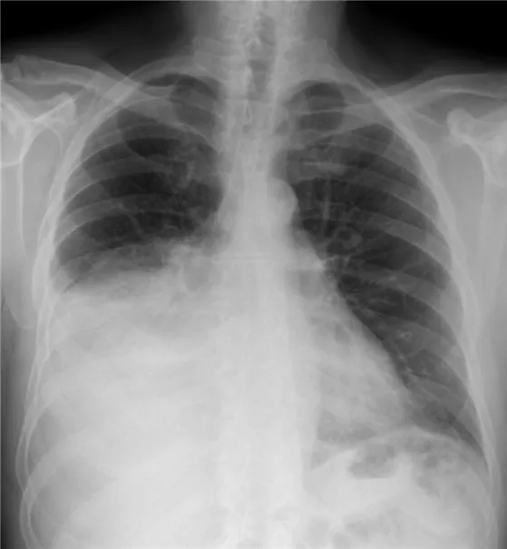 • 고열, 기침, 가슴 통증이 있는 환자의 가슴 X선에서 우측 폐의 pleural effusion이 확인된다.
