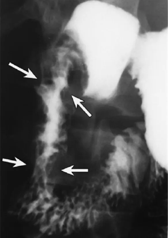 • 담즙성 구토를 호소하는 환자에서 위장관조영술의 filling defect가 관찰되어 폐색이 구토의 원인으로 보인다.