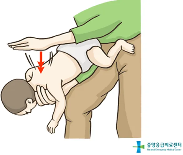 • 가장 먼저 양쪽 어깨뼈 사이를 5회 때린 후 머리가 천장을 향하도록 뒤집어 가슴을 5회 압박하는 것이 올바른 방법이다.