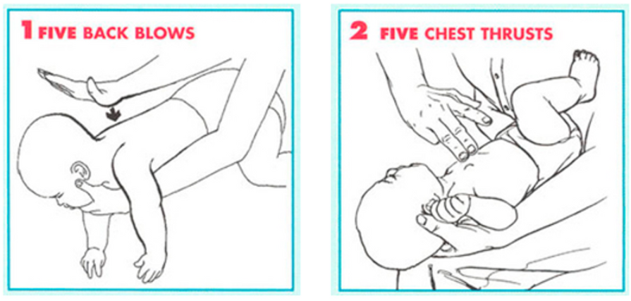 영아의 기도 이물질을 제거하기 위하여 five back blow-five chest thrust를 시행한다.