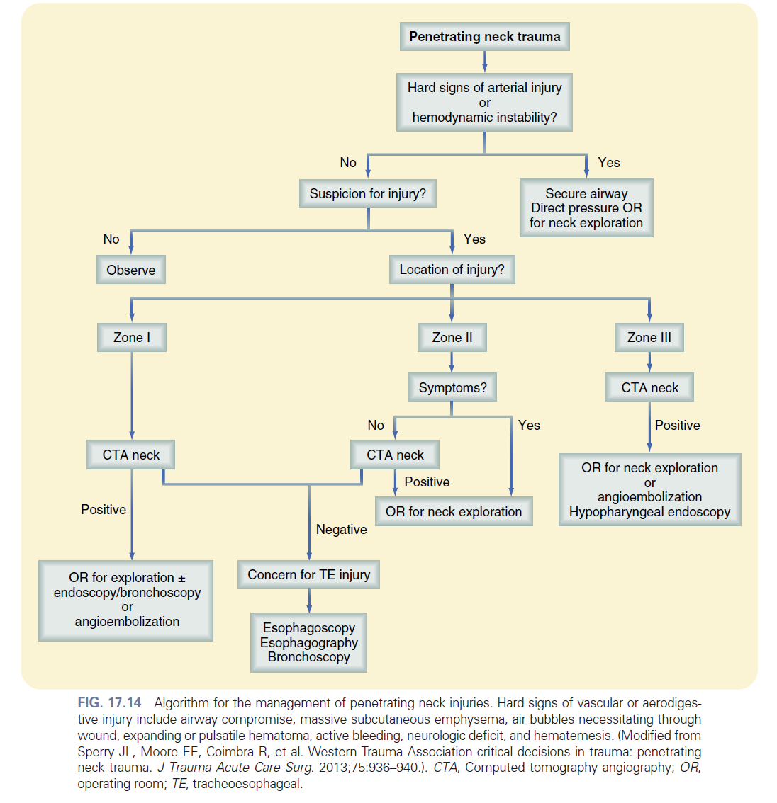 •경부 외상에서 명백한 기도손상, 활동성 출혈, 혈역학적으로 불안정한 경우 바로 수술적 탐색을 시행한다.