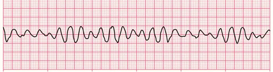 • 심정지 직후 확인한 심전도에서 식별 불가능한 QRS complex가 특징적인 심실세동(VF)이 관찰된다.