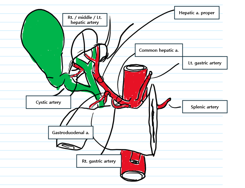 - hepatic a. proper : 진짜 liver로 가는 동맥, left와 right로 나뉘고, 이중 right에서는 cystic a. 를 분지한다.