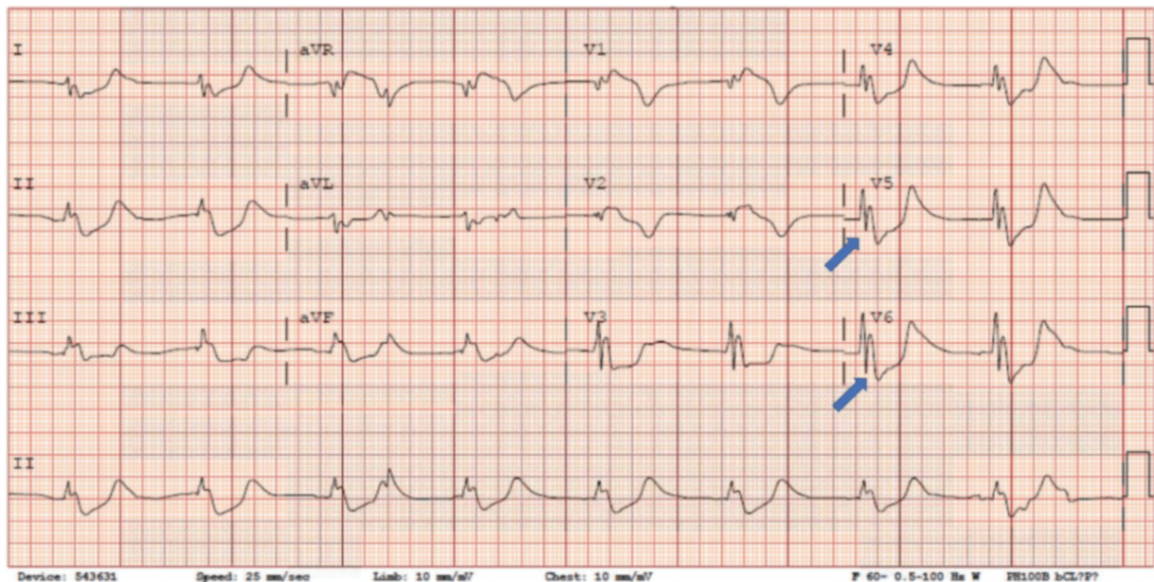 • 의식저하, 저혈압, 서맥, 호흡수 저하, 차갑고 창백한 피부를 통해 저체온증을 의심할 수 있다. ECG에서도 화살표 부분에서 J-point에서 Osborn wave가 관찰되고 있어 저체온증이다. 의식이 저하되어 있으므로 최소한 중등도 이상의 저체온증에 해당하며 능동적인 외부 재가온 치료가 필요하다.