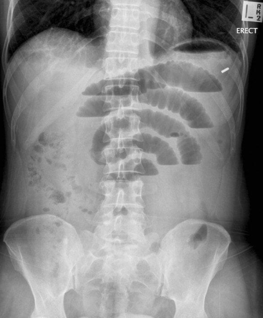 • 복부 수술력이 있는 여성에서 복통, 복부 팽만, 압통이 있어 촬영한 X선에서 소장이 확장된 loop가 air-fluid level과 함께 보이고 있어 소장폐쇄를 의심할 수 있다. 우선적으로 코위관 삽입을 통해 장내 압력을 줄여주고, 수액을 투여하여 탈수를 교정한다.