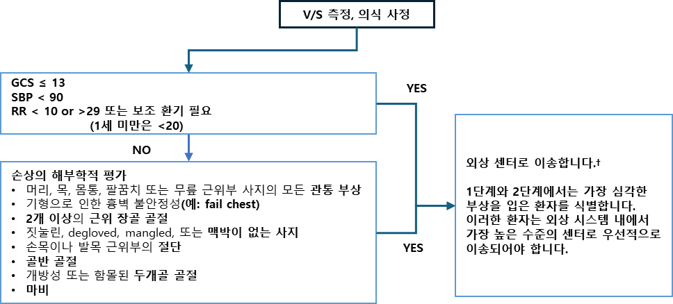 • 다른 풀이로는, field triage(환자의 중증도 분류)에서 GCS가 13점 이하, SBP가 90 미만, RR이 분당 10 미만 또는 29 초과이라면 가장 상위 레벨의 외상센터로 이송해야 한다. 호흡수가 분당 32회로 가장 높은 수준의 외상센터로 이송해야 할 조건에 해당한다.
