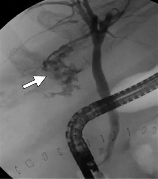 ERCP에서 cystic duct stump clipping site로 조영제 누출이 관찰되고 있다. cholecystectomy 후 cystic duct(담낭관)의 결찰이 불완전하게 되어 누출이 있는 것으로 보인다. ERCP 시술 중 stent를 CBD에 삽입하여 수술적 처치 없이 leak를 방지할 수 있으며, 복강 내로 leakage로 인해 fluid collection이 있는 경우 경피적배액술을 시행할 수 있다.