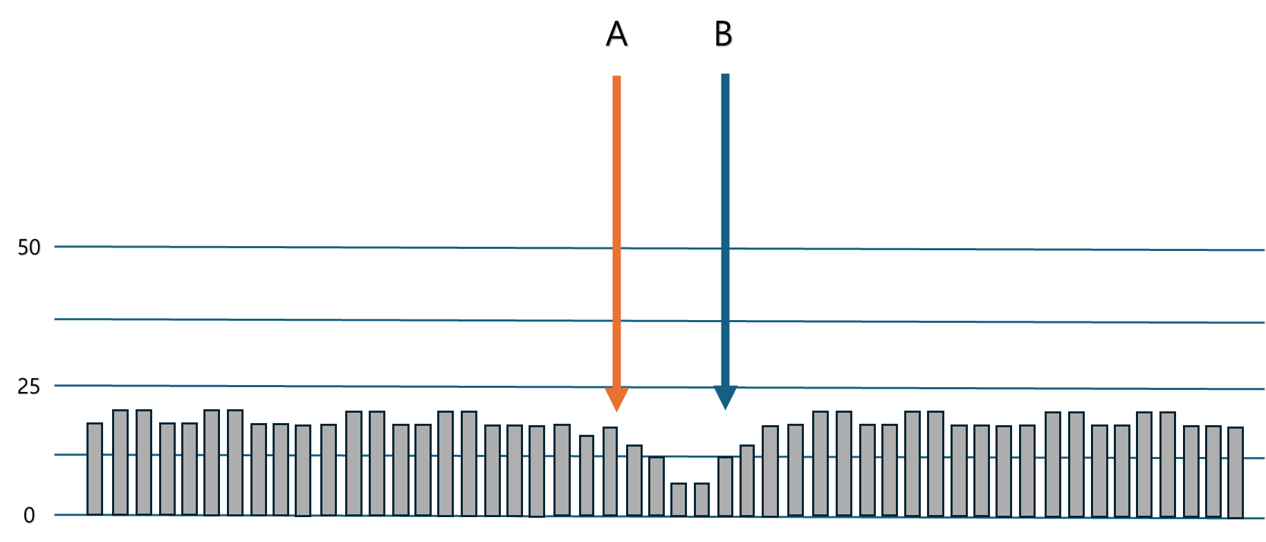CPR에서 호기말 이산화탄소분압(ETCO2) 감시는 시행자가 가슴압박의 깊이와 속도를 적절히 유지하는 기준을 제시하며, 시행자의 피로도를 확인하는 데 도움을 준다. 또한, 호기말 이산화탄소분압이 갑자기 상승하여 유지되는 것을 자발순환회복의 지표로 본다. A에서 ETCO2 분압이 줄어들고 있어 가슴압박 시행자의 피로도로 인해 비효율적인 흉부 압박이 있었음을 알 수 있고, 새 구조자가 참여하며 다시 효과적인 가슴 압박으로 ETCO2가 상승했음을 알 수 있다.