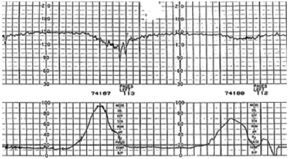 • 전자태아심음감시 결과 onset to nadir > 30s(작은 칸 3칸)이므로 late deceleration이 관찰되므로 fetal distress 가 의심되므로 응급제왕절개술을 시행한다.
