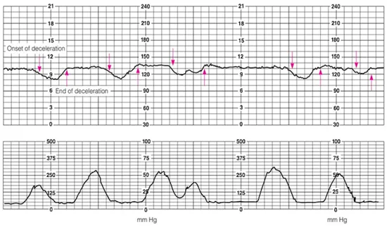 • 경과관찰: Cord compression에 의해 variable deceleration이 나타나므로 태반 혈류 증가를 위한 조치를 취해야 한다.