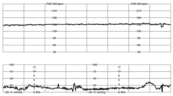 • NST 상 loss of variability가 관찰되어 심각한 태아곤란을 시사하므로 응급제왕절개술을 시행한다.