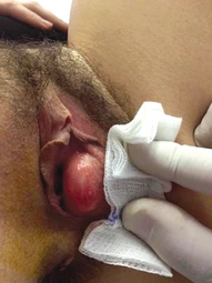 • 외음부의 종기가 만져진다며 내원한 32세 여성에서 시행한 신체진찰상 바르톨린샘 위치의 종괴가 보이고 있다. 바르톨린샘 낭종이 감염이 발생하여 바르톨린샘 농양이되면서 크기가 커지고 통증이 생긴 것으로 볼 수 있다.