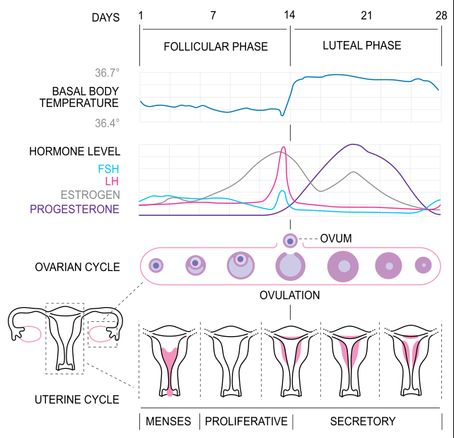(1) 월경 시작일을 1일째로 하여 28일 주기로 월경 주기가 반복되며, 배란은 14일째에 일어난다. 1일부터 14일까지를 난포기(follicular phase), 14일부터 28일까지를 황체기(luteal phase)라고 한다.