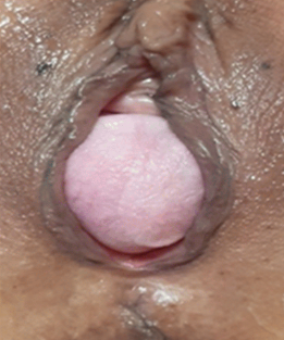 다산의 히스토리가 있는 고령 여성에서 시행한 신체진찰 상 질벽이 질입구 밖으로 탈출하고 있다. pelvic organ prolapse는 수술적 교정으로 치료할 수 있으나, 환자가 최근에 심근경색이 있어 수술 위험이 크므로 페서리로 치료하는 것이 옳은 선택이다.