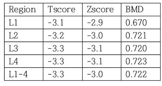 • 골밀도 검사 상 L1-4 T-score < -2.5 이므로 골다공증을 진단할 수 있다. 스테로이드는 골다공증 유발의 위험인자로, 폐경 후 여성호르몬 부족, 스테로이드 복용 모두 골다공증 유발하였을 것으로 보인다.