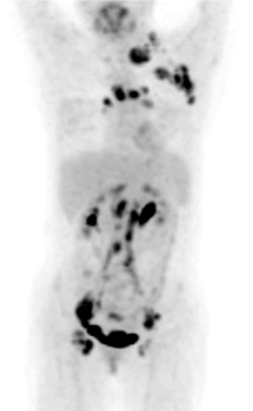 • SCC 종양표지자 수치 증가, 세침흡입검사 상 편평상피암, PET-CT 상 자궁경부를 포함한 전신에서의 uptake 소견으로 자궁경부암의 재발 및 원격 전이를 진단할 수 있다.