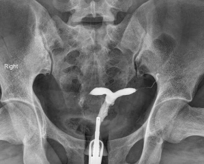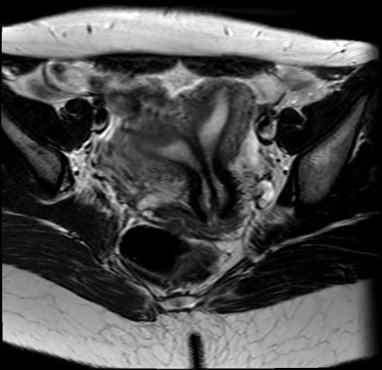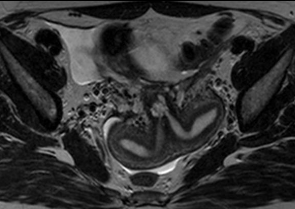 • MRI상 자궁은 부피가 크고 앞쪽으로 기울어져 있으며, 두 개의 자궁강이 septum(low signal density로 보이고 있음)로 나뉘어 있다. 이 저신호는 자궁경부까지 뻗어 있으며, fundus의 평평한 윤곽이 관찰된다. 이는 완전 중격자궁(complete septate uterus)을 시사한다. 쌍각자궁의 경우 fundus에서 1cm 이상으로 깊게 함입되어 있다.