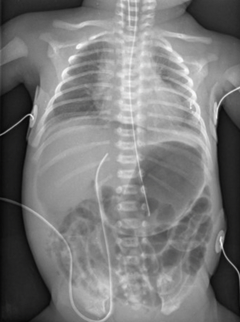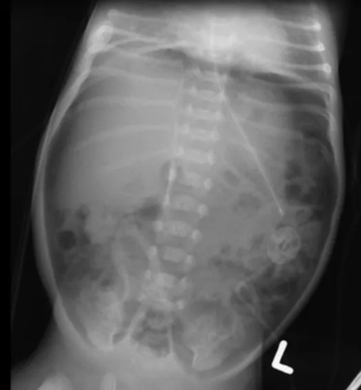 재태연령 31주, 출생 체중 920g의 출생 6일 신생아가 복부 팽만, 무호흡, 발열, 혈변 등의 증상이 있다. 조산아에서 장관영양을 하다 발생한 복부 팽만, 구토, 혈변 등의 증상을 통해 신생아 괴사성장염을 의심할 수 있다. 또한 AXR에서 창자벽공기증, 기복증(복강의 outline이 air로 윤곽이 드러남)이 관찰되고 있기에 괴사성장염으로 인한 장 천공이 기복증까지 일으켰다고 볼 수 있다.